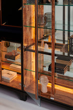 Integrating architecture with materials found in nature, this tall linear cabinet illuminates curated displays and collectables. Finished in Greenway, a complex mix of dark brown, black, and olive tones, the case exterior offers rich contrast to the door handles and interior, made from a digitally printed spalted maple. Clean-lined and visually light, it has two glass doors, four adjustable glass shelves, and a single, wood-framed glass shelf. Features a back-lit mirrored panel with LED lighting. Modular design lets you style in pairs with our Get a Handle On It cabinet to fill a wall and create your own display.