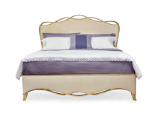 Graceful in its softness and refinement, The Ribbon Bed is a bed that will wind its way into your heart. The delicately carved frame curves around the headboard and flows down along the side rails and footboard in decorative style. Not to be missed is the depth of carving that adds elegant dimension to this sumptuous bed. Bathed in a warm Gold Bullion Leaf finish, the free-flowing wood carving is the perfect trim for the plush cream velvet that surrounds the entire bed, embracing you in elegance. The bed is suspended off the floor on rounded trapeze feet. Distinctly French in style, this piece is the prettiest of presents for any bedroom.