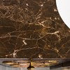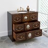The Bulls Eye Sink Chest is made of Mindi wood solids and veneers and has a medium brown distressed finish with antique gold leaf trim surrounding clear bulls eye mirrors and wood panels. Unique hardware is made of solid polished brass. There is one top faux drawer and two over sized drawers beneath for maximum storage capacity.