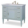 This sink chest crafted of White Oak features six drawers, one door and a white marble top. The chest is raised on tall tapering feet with antique brass ferrules. Finished in polar blue with gold leaf striping. Brass pulls.