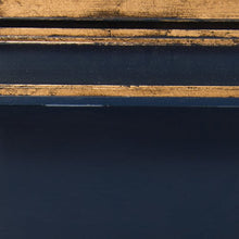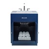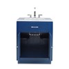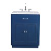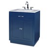 This sink chest, crafted of Mahogany, features a white marble top and white porcelain sink. Acrylic hardware is highlighted on shaker style doors. Shown in cadet blue.