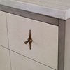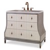 Walnut solids and veneer finished in ash grey and linen. Drawer fronts are faux Shagreen leather with antique ivory finish. Uniquely designed pulls with diamond back plate are made of solid brass with a light antique finish. Top panel has three faux drawers. Two drawers with full extension metal glides provide ample storage. Nestos Grey marble top.