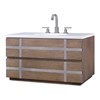 A Carrera white marble top is raised on a ceruse oak cabinet with one working drawer. Stainless steel banding. Porcelain sink bowl installed. Hangs on metal cleats (included).