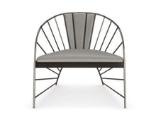 The designer created a perfect scale model to refine the details of this sleek modern chair, poised to make an unforgettable statement in a Tungsten finish. Architecturally inspired, its curvilinear form is meticulously crafted from a series of tubular metal spokes radiating from a sturdy, yet elegant hoop frame. Igniting and inviting: a channel-tufted back and rounded seat in a platinum-toned, embossed fabric with the luxe look and feel of leather.