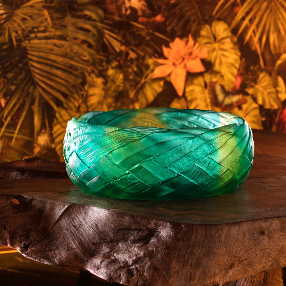 Daum's creative studios explore this art form by adapting the basketweaving technique to sculpture. Natural fibers are braided and then reshaped into vases and bowls. Fronds of different plants criss-cross and blend—fresh, green, and slender—forming vessels where one can showcase cut flowers or freshly-harvested fruits. For an added touch of lush, tropical flora native to the islands where basket-weaving is still common practice, yellow vanilla flowers adorn and perfect these beautiful pieces.